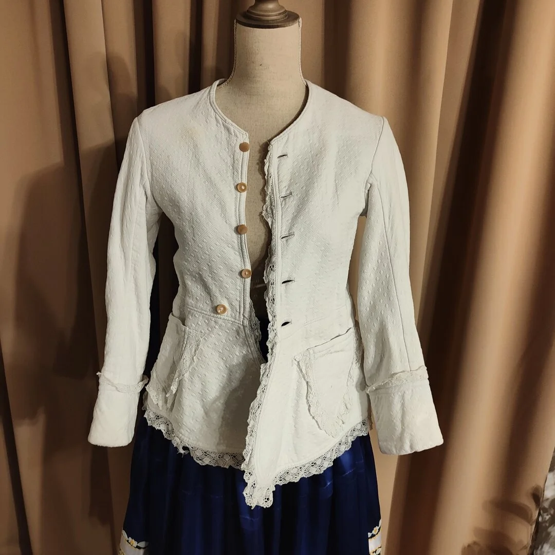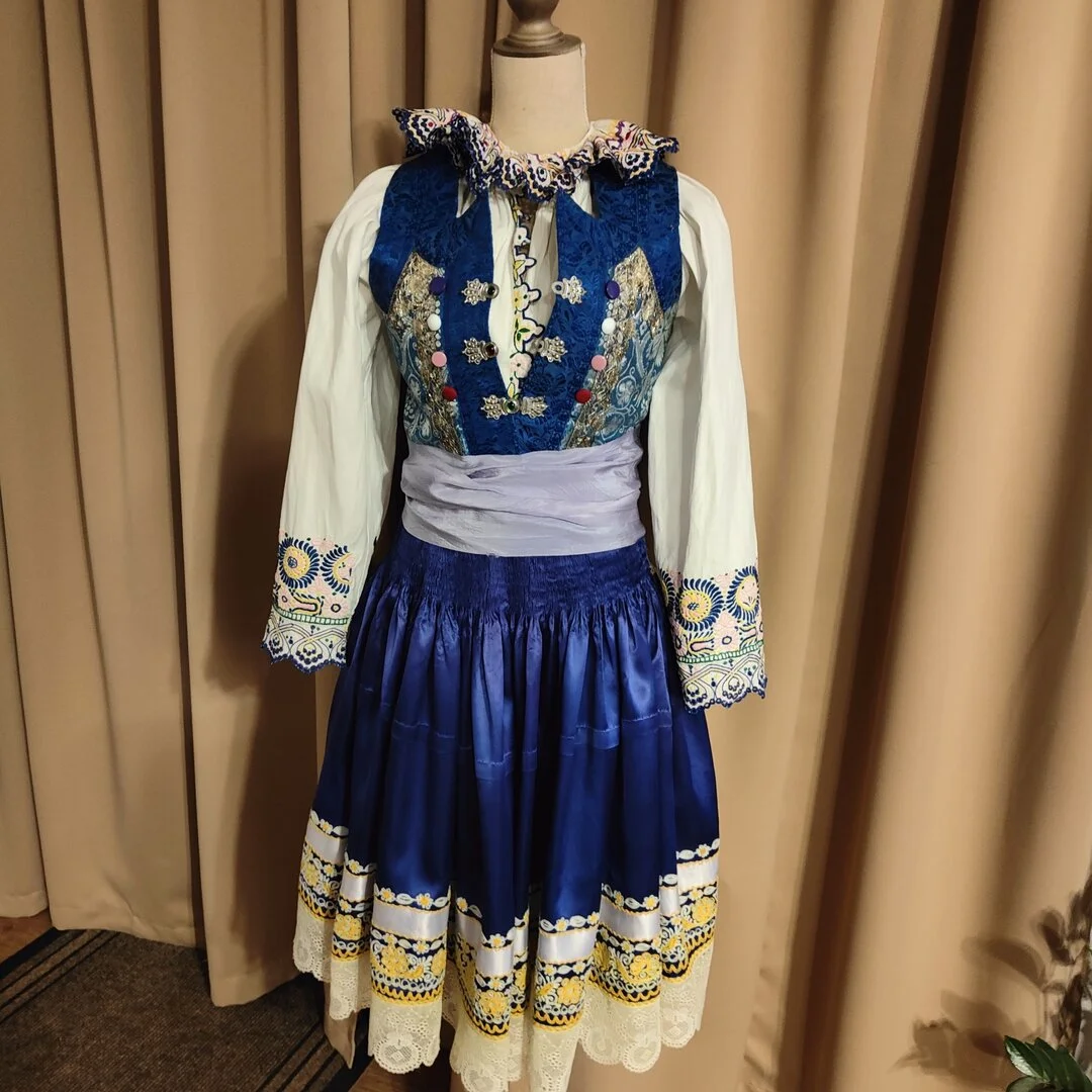 Starý detský piešťanský kroj, má dva pruclíky - jeden starý fialový a jednu červenú repliku.